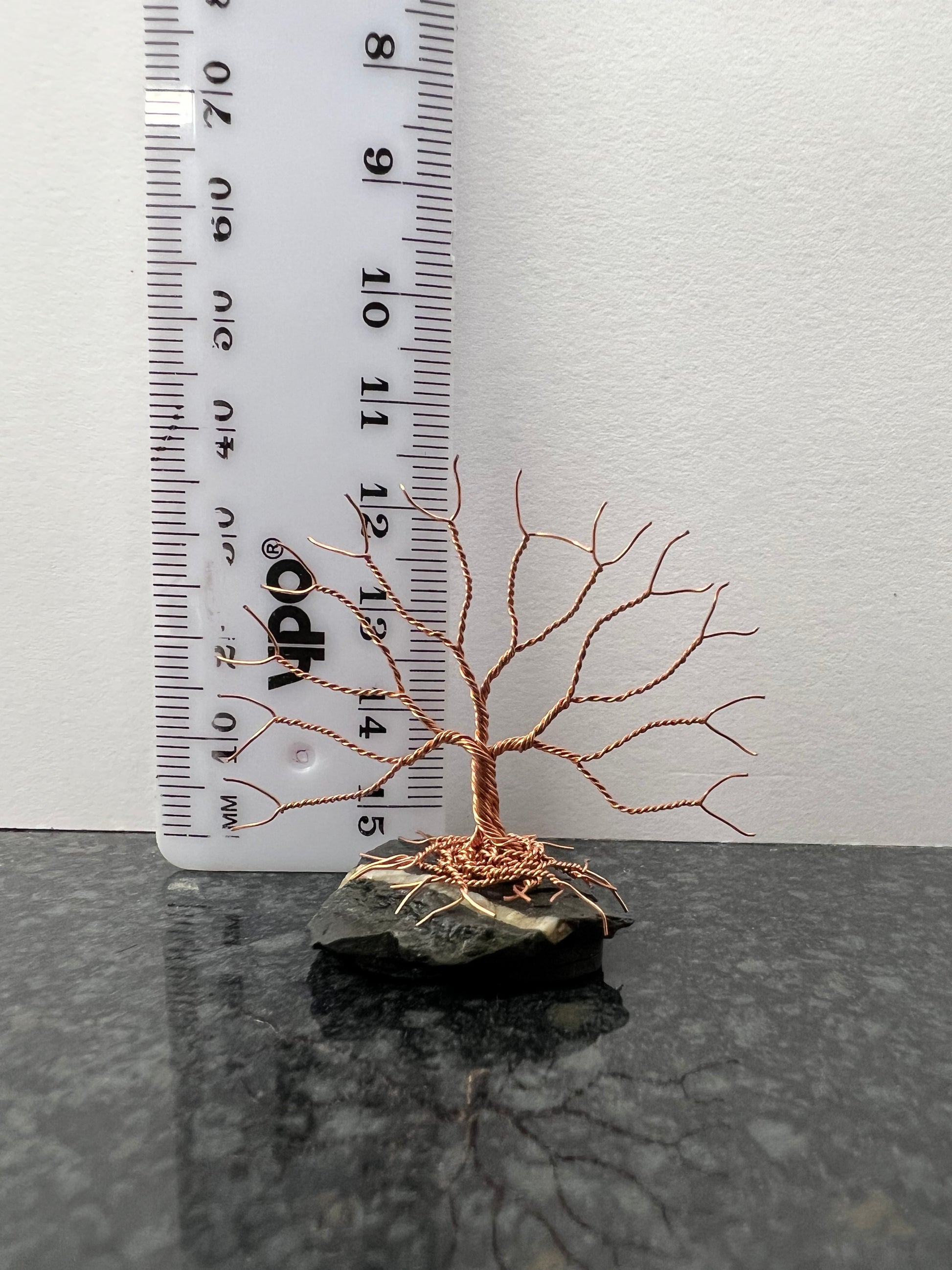 Approximately 24 pieces of copper wire are hand twisted to make my mini Celtic tree sculptures. See trolley coin in photos for size. The tree is attached to the stone with copper wire through a drilled hole in the stone, for a secure and discrete fixing.