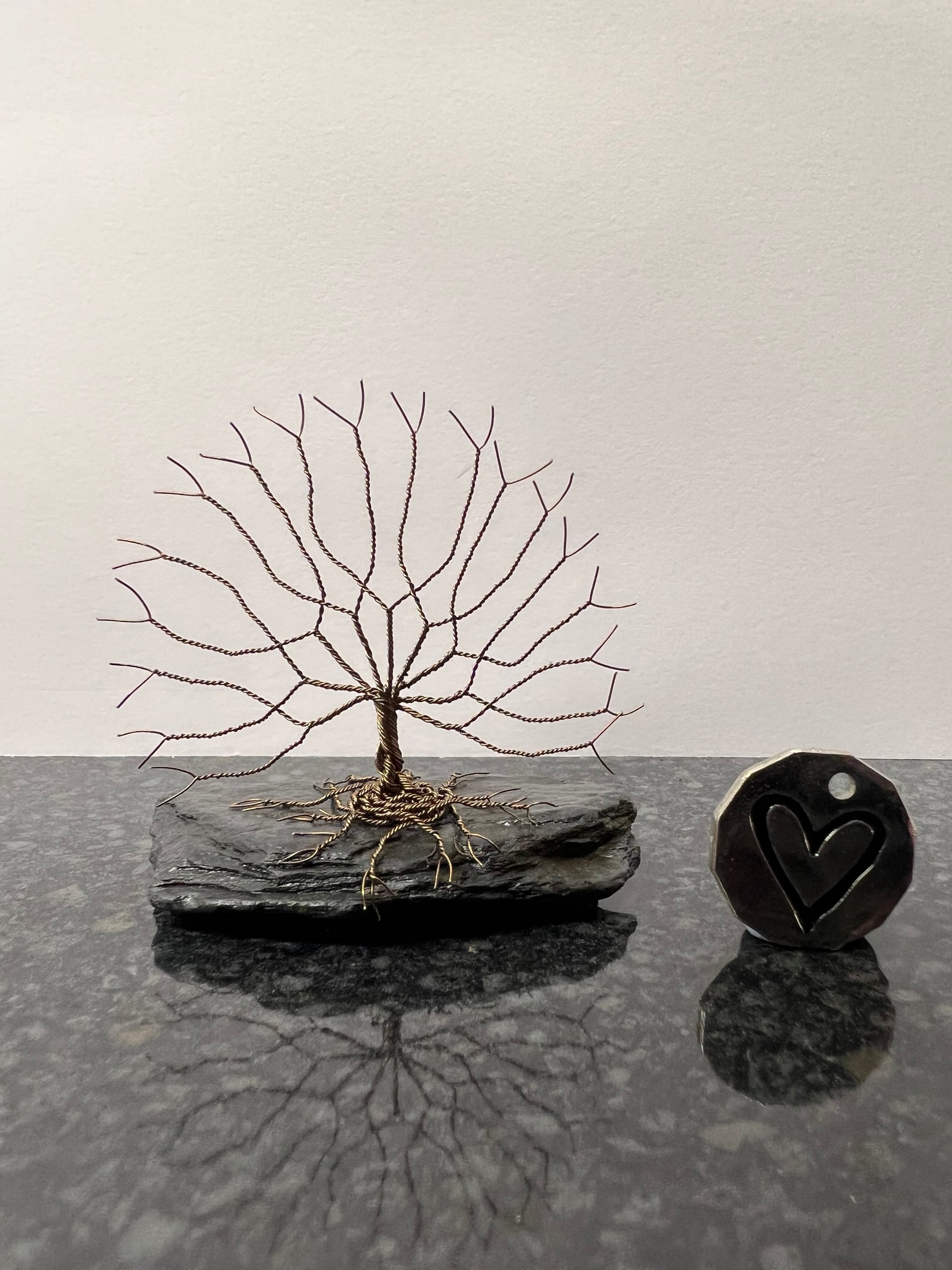 Approximately 36 pieces of copper wire are hand twisted to make my small Celtic tree sculptures. See trolley coin in photos for size. They measure approx. 4-7cm depending on the shape. The tree is attached to the stone with copper wire through a drilled hole in the stone, for a secure and discrete fixing.