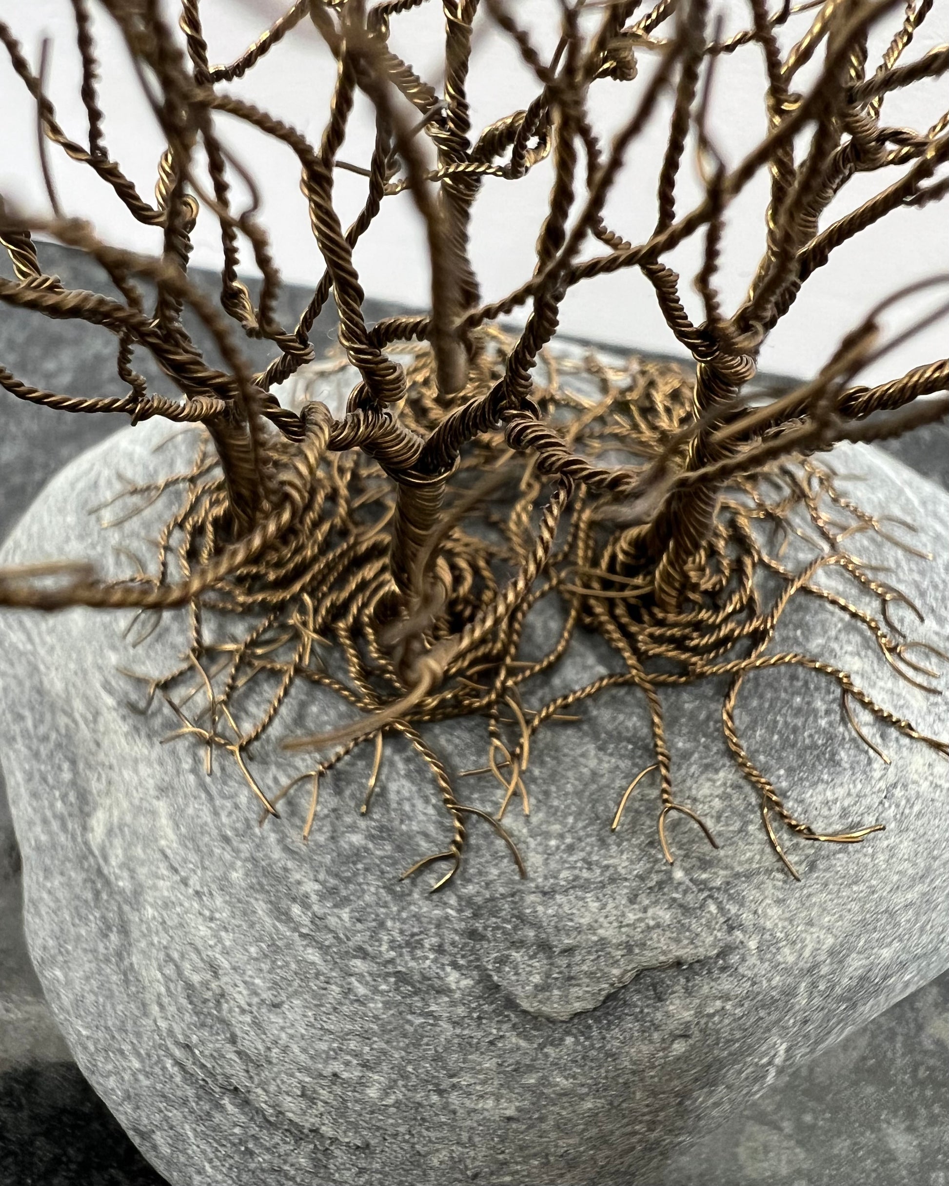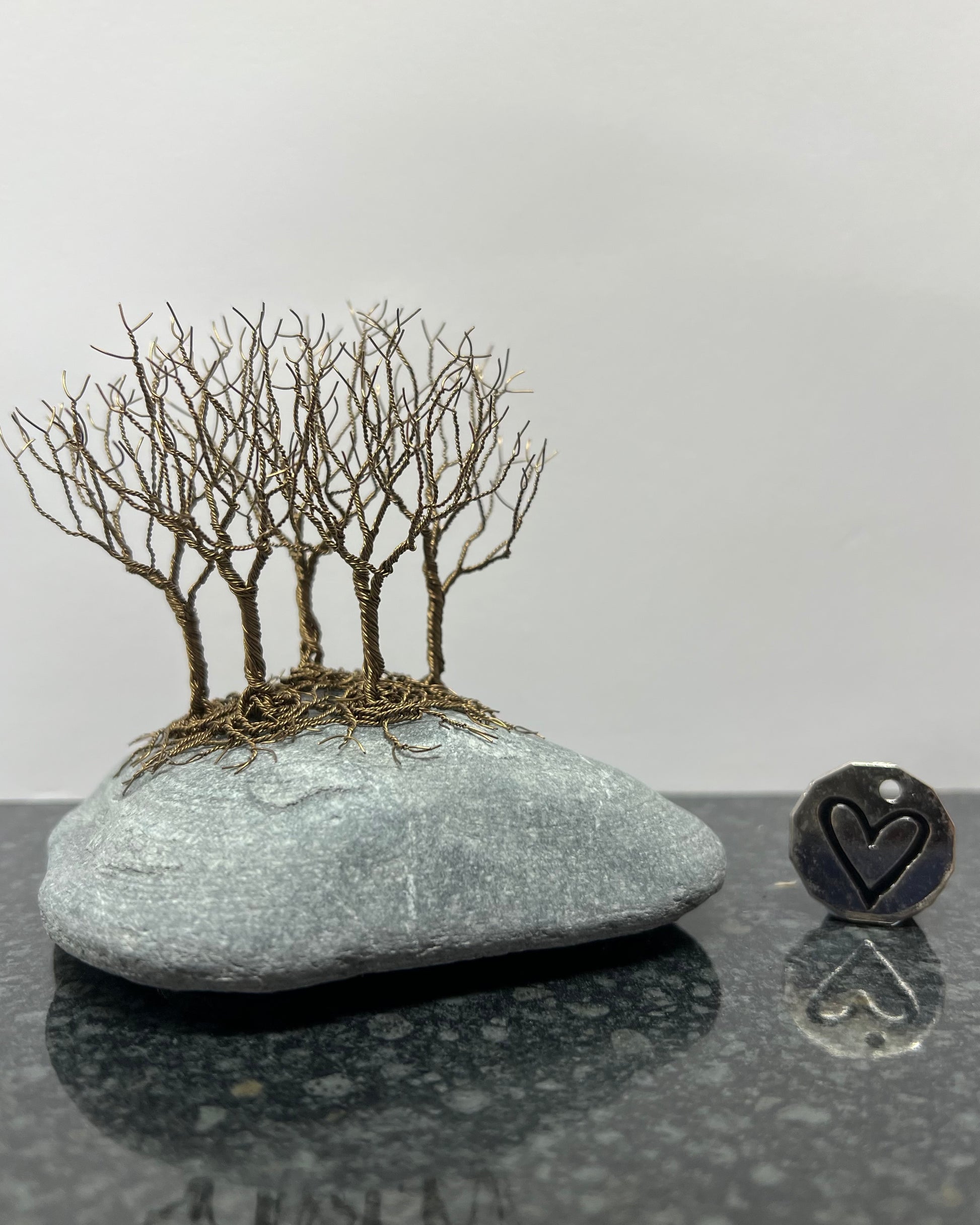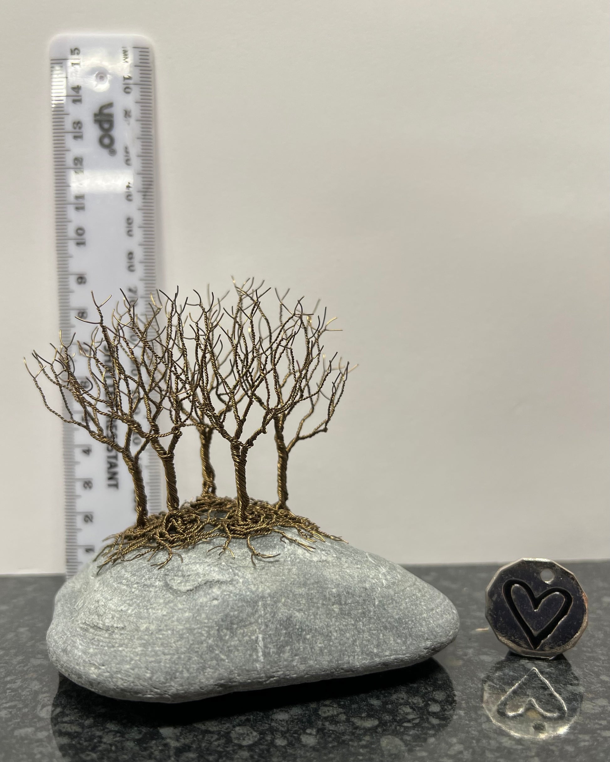 Approximately 36 pieces of copper wire are hand twisted to make my small Celtic tree sculptures. See trolley coin in photos for size. This sculpture (including cobble) measures approx. 10cm high and10cm wide. The trees are attached to the stone with copper wire through a drilled hole in the stone, for a secure and discrete fixing.